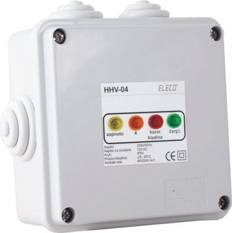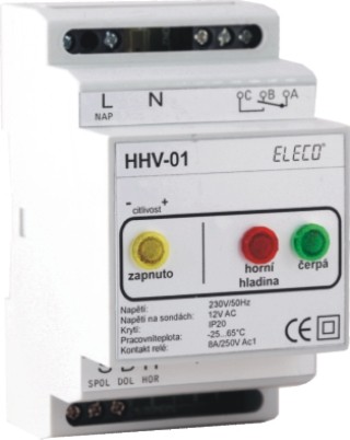 | Fucnction | Hlídače jsou určeny pro hlídání dvou úrovní hladin s výstupním střídavým napětím na sondách 12 V AC. Relé spíná při dosažení horní úrovně hladiny (kapalinou zaplavena horní sonda) a rozpíná po poklesu pod dolní úroveň hladiny (kapalina poklesla pod dolní |
